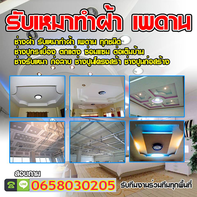 บริการรับเหมาต่อเติม ตกแต่งภายใน ฝ้าเพดาน ฝ้าฉาบเรียบ ฝ้าทีบาร์ ไฟ สี กระจกอลูมิเนียม โครงหลังคา กั้นห้อง ผนัง เบารวมถึงการซ่อมแซมบำรุง บริการทุกรูปแบบอย่างครบวงจร ประเมินหน้างานให้ฟรี